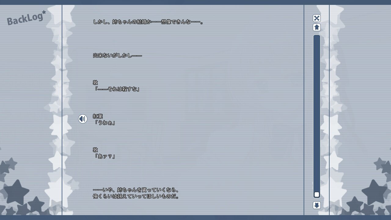 ・用意出来たBGMの数が少ないことが原因だろうが、日常シーンで多用されるトロピカル●職の亜種みたいな曲を延々と聴かされるので気が狂いそうになる。初心者の時に本作をプレイしていたらエロゲごと嫌いになっていてもおかしくない。